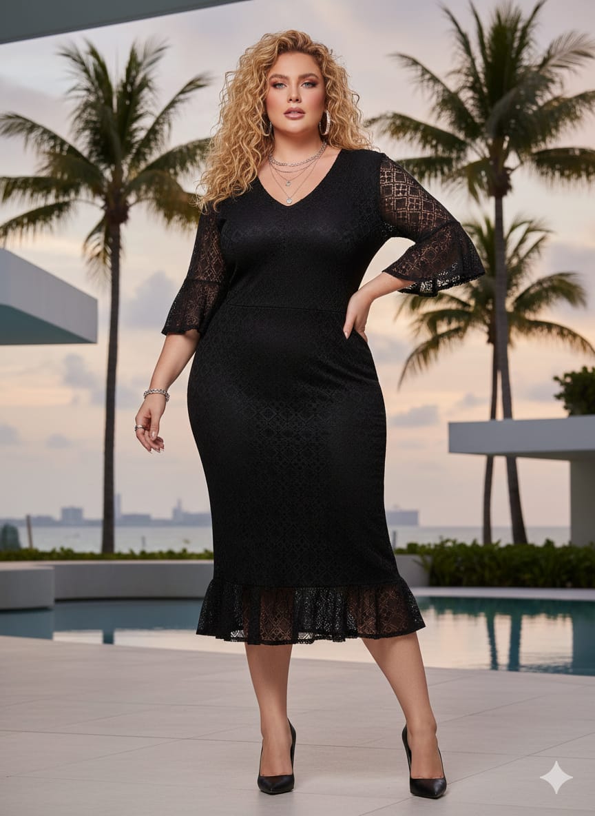 A modelagem ajustada realça as curvas com elegância, enquanto o detalhe em renda na barra com leve babado adiciona movimento e charme na medida certa. Ideal para eventos, jantares, ocasiões especiais ou produções noturnas mais refinadas.